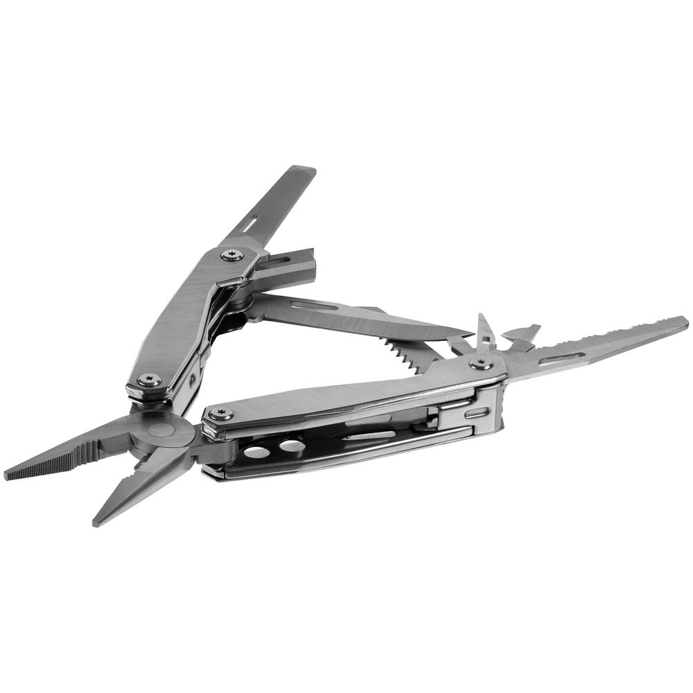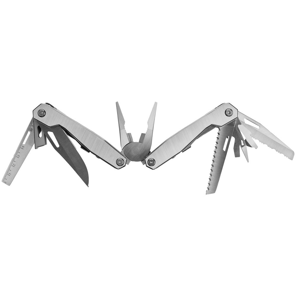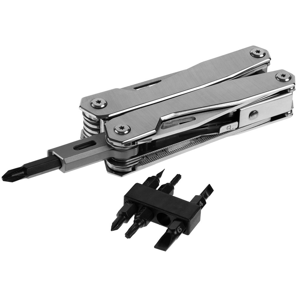 В комплекте мультитул, чехол и набор из 4 двусторонних съемных бит.