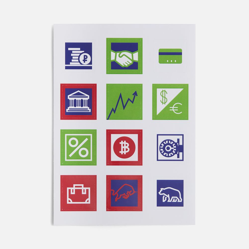 В каждой части общего рисунка изображены главные символы, связанные с финансами.