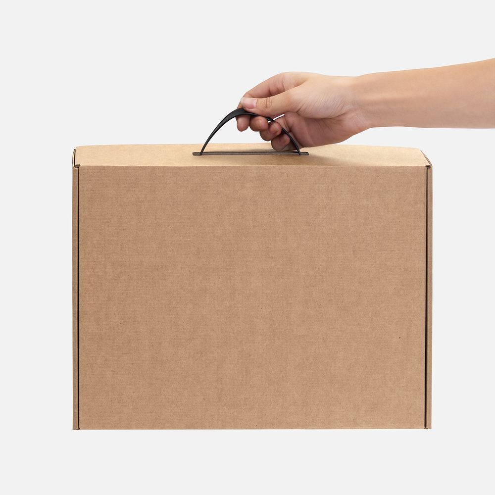 Самосборная коробка-шкатулка со вставной пластиковой ручкой.