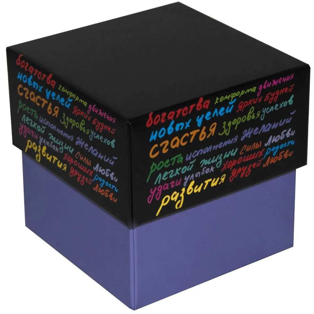 Подарочная коробка совмещает в себе функции упаковки и открытки: на ней уже написаны всевозможные пожелания. Коробка изготовлена с применением лучших полиграфических технологий и заламинирована. На свободном от декора черном поле можно разместить логотип компании, текст или рисунок.Возможные способы и стоимость нанесения логотипа предоставляются по запросу.