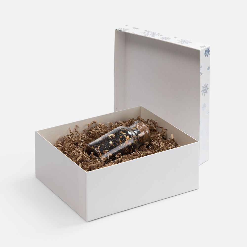 Коробка выполнена из переплетного картона толщиной 1,5 мм, кашированного бумагой TPG с тиснением серебристой фольгой.