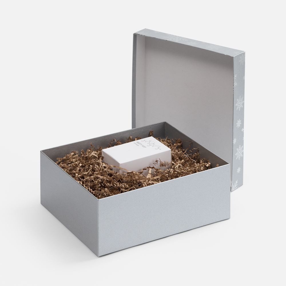Коробка выполнена из переплетного картона толщиной 1,5 мм, кашированного бумагой TPG с тиснением серебристой фольгой.