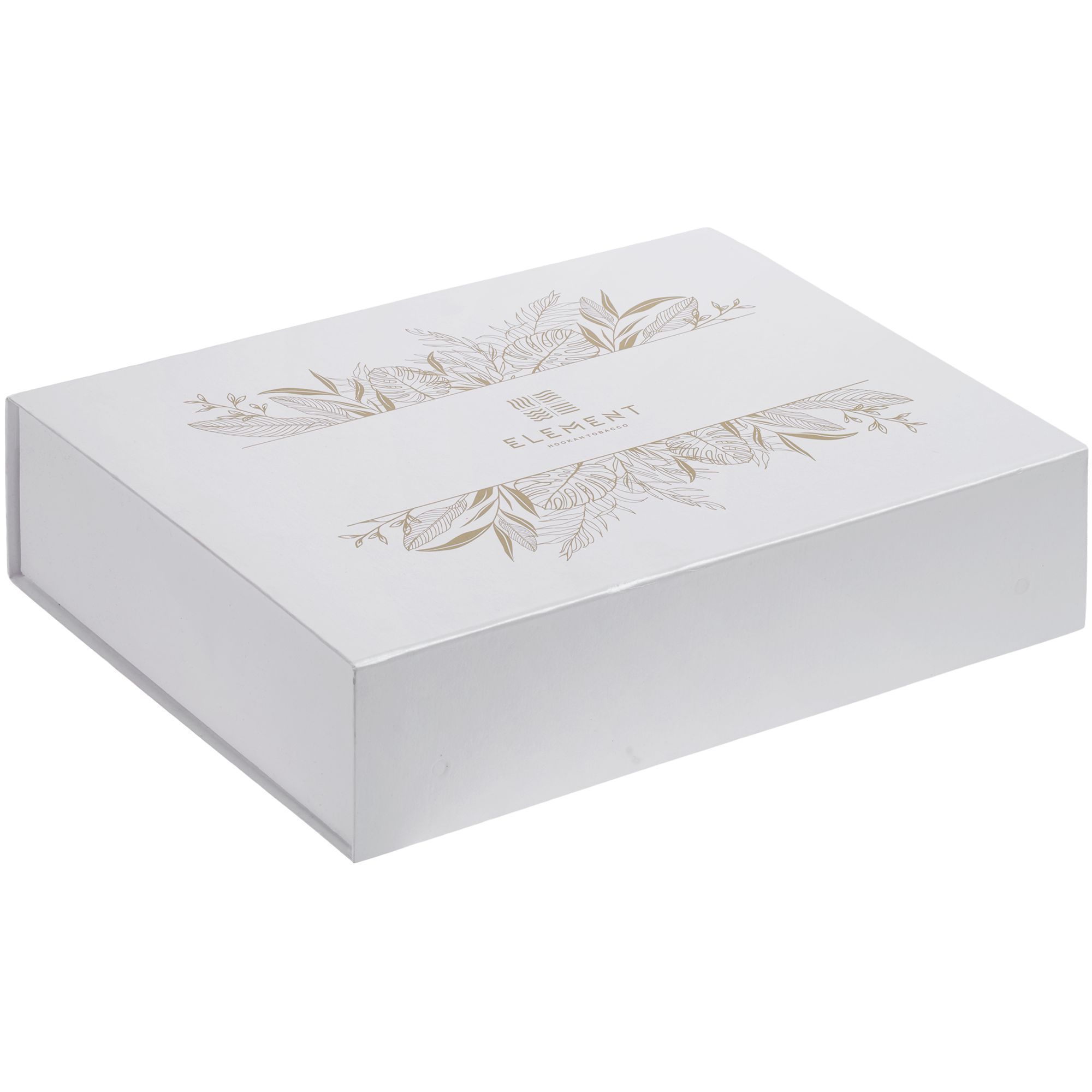 Коробка изготовлена из переплетного картона, кашированного дизайнерской бумагой Majestic цвета «Белый мрамор».
