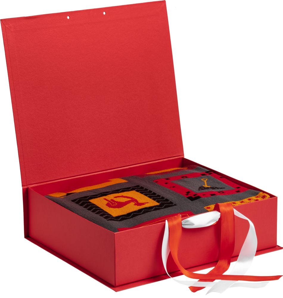 Коробка выполнена из переплетного картона, кашированного дизайнерской бумагой Magic, с крышкой на лентах.