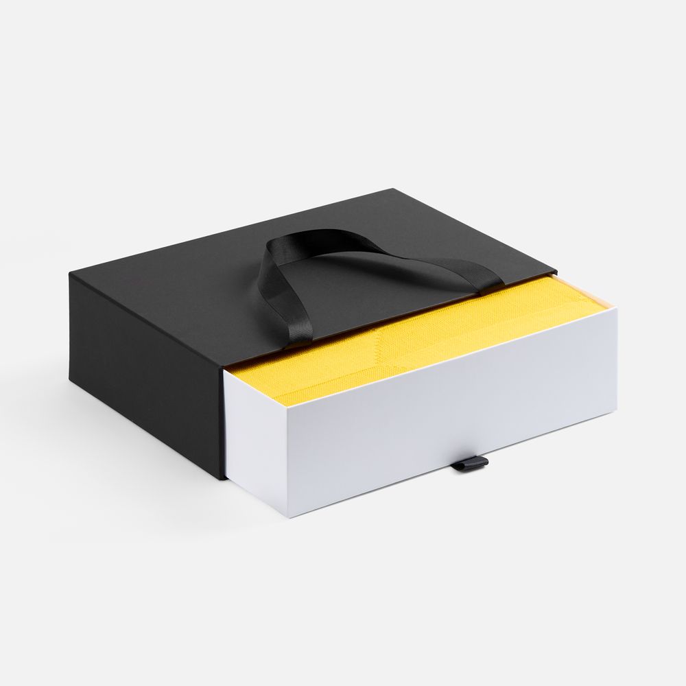 Внешний короб каширован дизайнерской бумаги и оснащен прочными ручками из репсовой ленты. Внутренний короб отделан белой бумагой, ламинированной матовой пленкой.