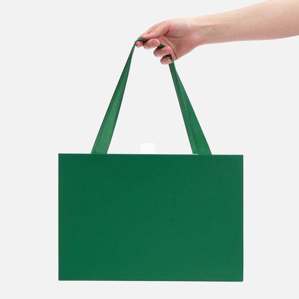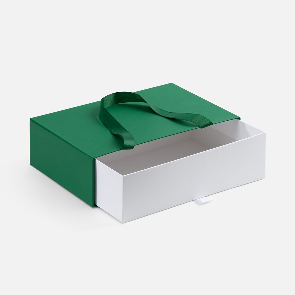 Внешний короб каширован дизайнерской бумаги и оснащен прочными ручками из репсовой ленты. Внутренний короб отделан белой бумагой, ламинированной матовой пленкой.
