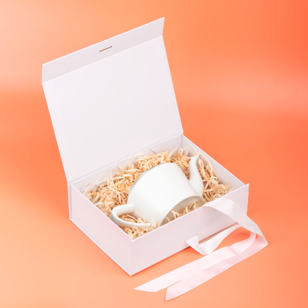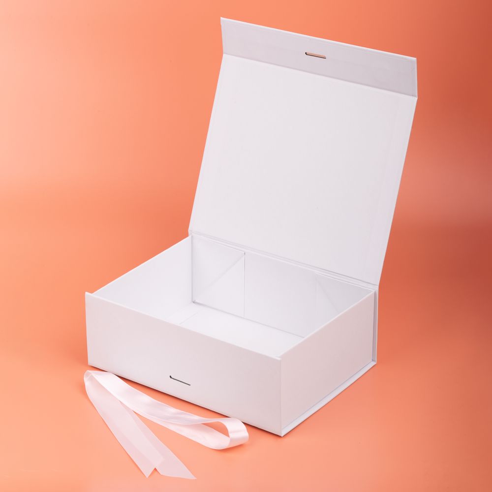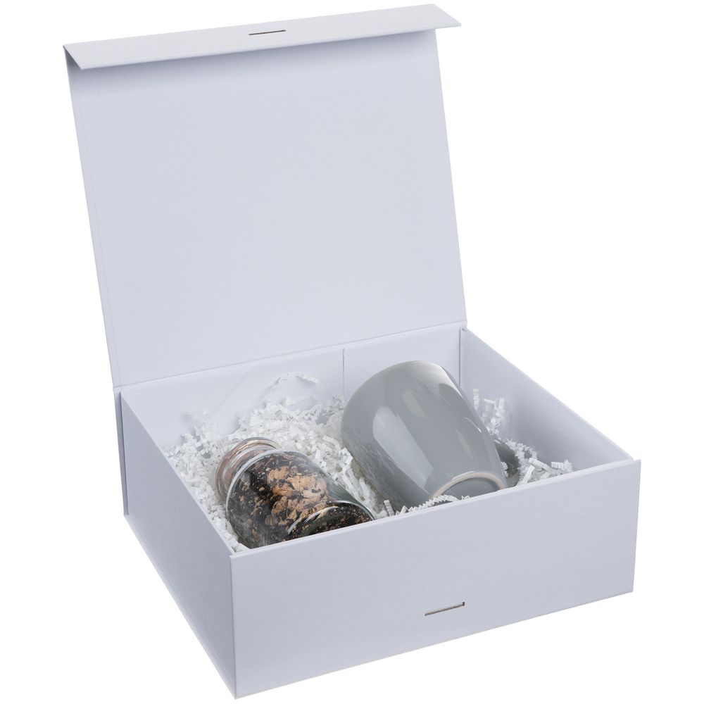 Коробка из переплетного картона, кашированного тонированной в массе крафтовой бумагой. Крышка на двух магнитах дополнительно фиксируется лентой.Толщина картона 2 мм.