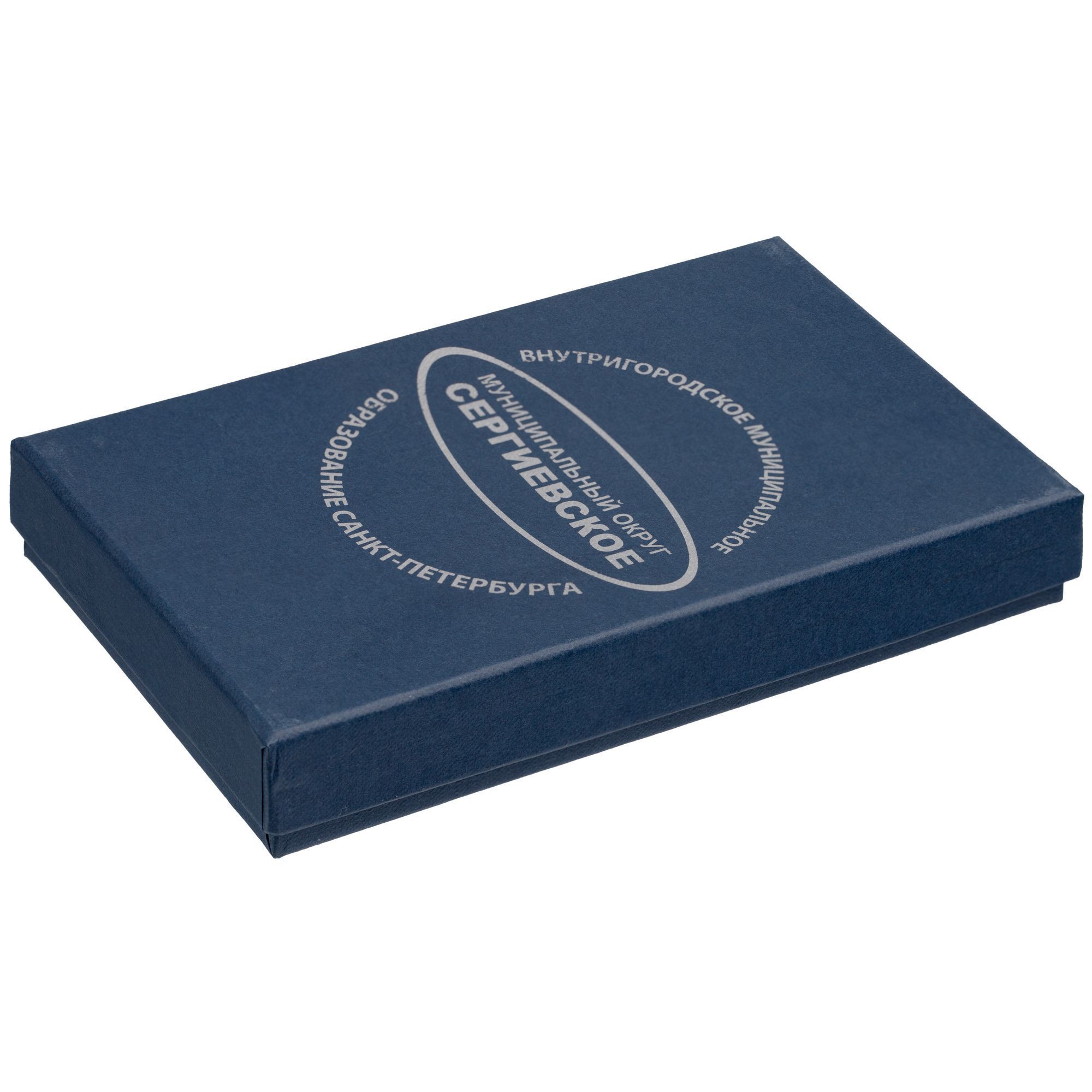 Коробка выполнена из переплетного картона, кашированного дизайнерской бумагой Malmero Bleu.