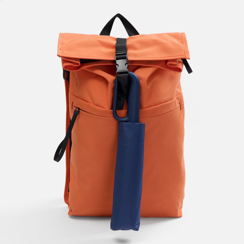 Преимущество обратного сложения заключается в том, что при закрытии внутренняя поверхность зонта остается снаружи, а мокрая сторона — запаковывается внутрь. За ручку-карабин удобно подвесить зонт на рюкзак или сумку.