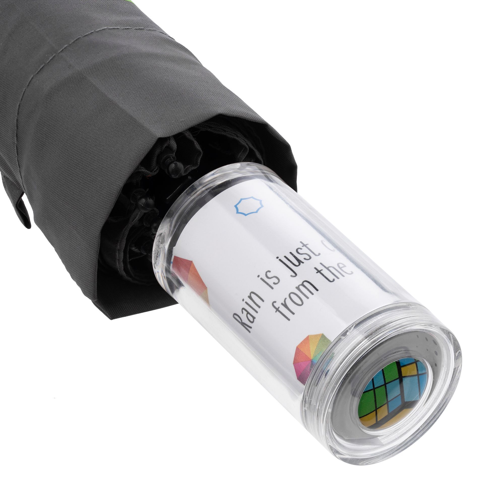 Складной компактный зонт Fillit привлекает внимание необычной прозрачной ручкой, которую можно наполнить яркими мелочами или вставить внутрь лист бумаги с напечатанным принтом или логотипом. Зонт снабжен системой WindProof, благодаря которой способен выдержать сильные порывы ветра.