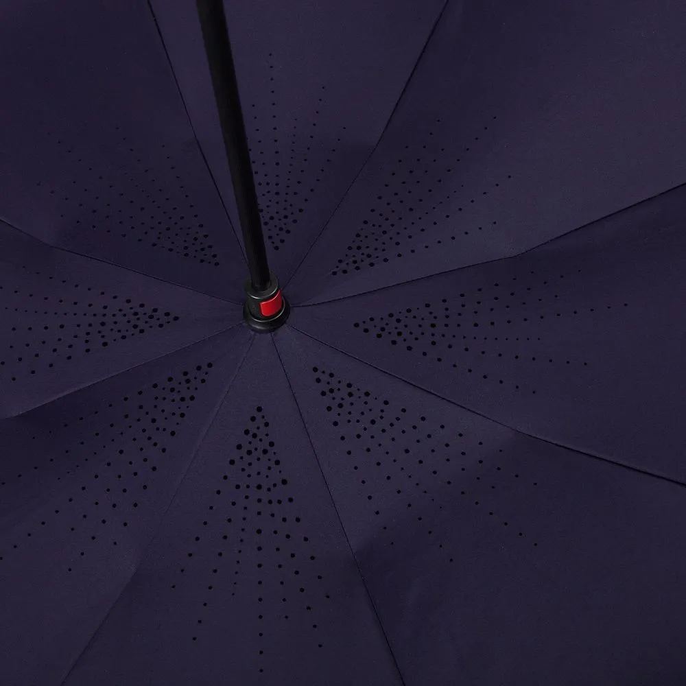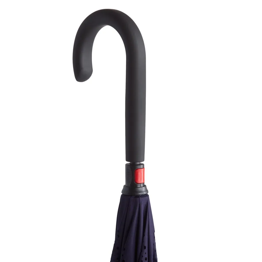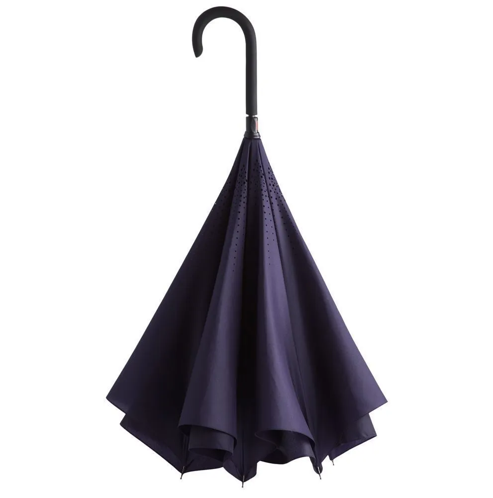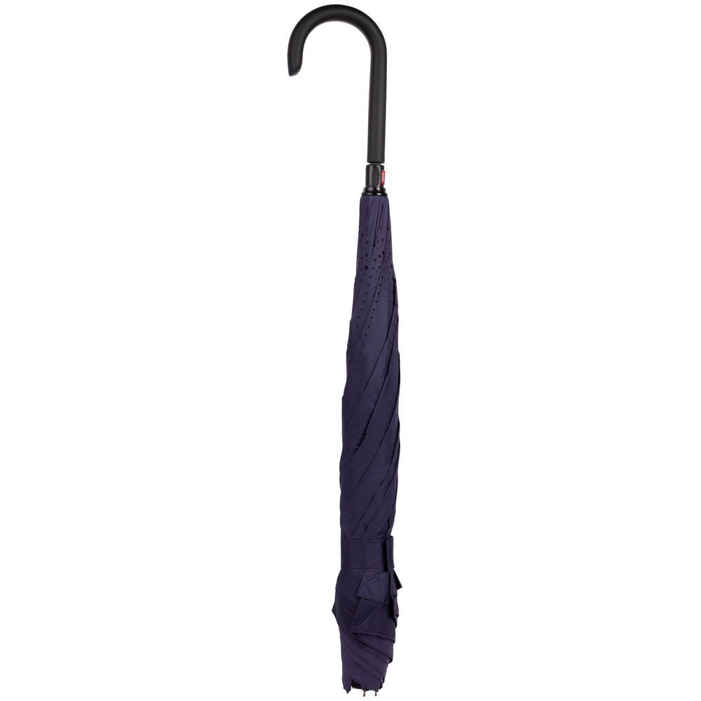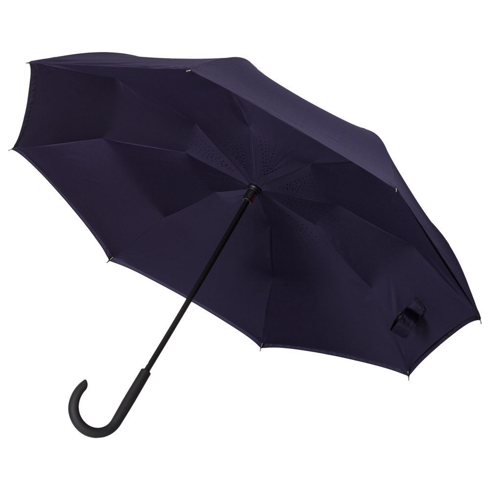 Это зонт-наоборот, зонт-наизнанку. Складываясь после дождя, он прячет мокрую поверхность в себя, а сухая остается снаружи. Для просушки его можно не только подвесить за ручку, как обычные зонты, но и поставить прямо на пол в полусложенном состоянии. Итог — мягкая щадящая просушка и минимум занятого мокрым зонтиком места.