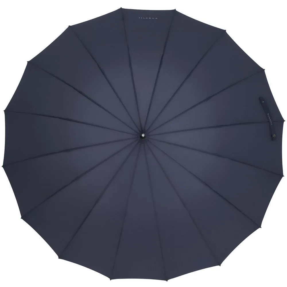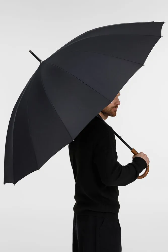 Солидный изысканный зонт с ручкой из дерева и 16 спицами. Большой купол легко укроет от дождя сразу двоих, а надежная конструкция выдержит даже сильный ветер.