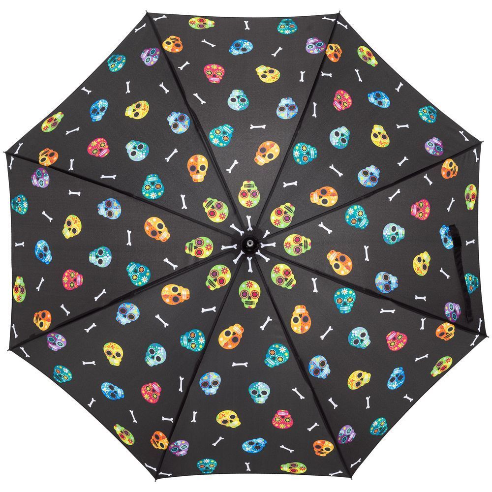 Зонт-трость с веселыми черепами-калаверами — символом мексиканского Дня мертвых — наполнит ваши прогулки под пасмурным небом атмосферой ярчайшего латиноамериканского фестиваля. Дождю не испортить ваш внутренний праздник!Зонт-полуавтомат, 8 спиц.